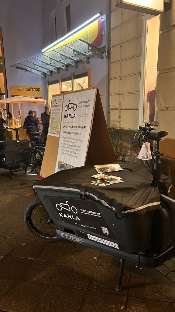 Am 20.09.2025 fand der Mobilitätstag vor dem Hauptbahnhof Kassel statt. Ab 9:30 Uhr erfolgte der Aufbau des Standes durch die Ehrenamtlichen der Lastenrad-Initiative. Ab 11:00 Uhr gings dann los mit dem Mobilitätstag. Das Glücksrad mit gespendeten kleinen und größeren Preisen war der Renner bei vielen Kindern und Familien. Nebenbei konnten viele Gespräche mit Interessierten geführt werden. Wo gibt es Standorte? Wie erfolgt die Ausleihe? Was kostet eine Ausleihe? Wann kommt der Standort in der eigenen Wohnumgebung?